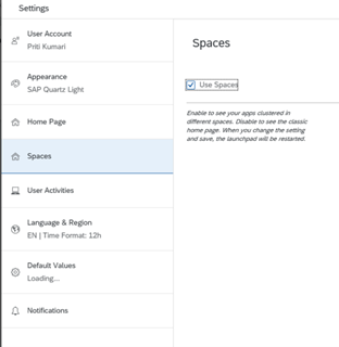 1. Click on your user initials in the Fiori homepage and select Settings