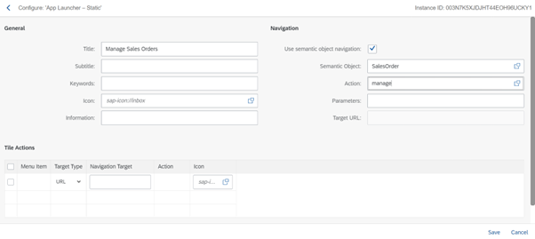 8. Click the plus icon under the App Launcher – Static and add the details you need for the app (these details can be found in the Fiori Apps Library – link here: https://fioriappslibrary.hana.ondemand.com/sap/fix/externalViewer/#)