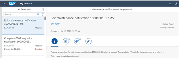 Similarly, the technician will get the notification of the task assigned to him in the My Inbox. Also, the technician can view the task and complete it. Simultaneously the same information will be informed to the planner in his/her My Inbox about the Tasks.