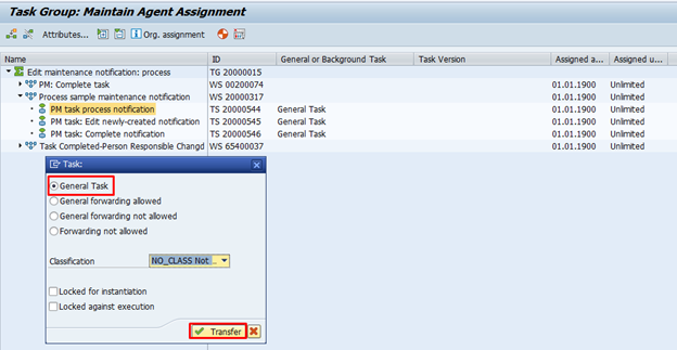 Click on transfer to set the general task.