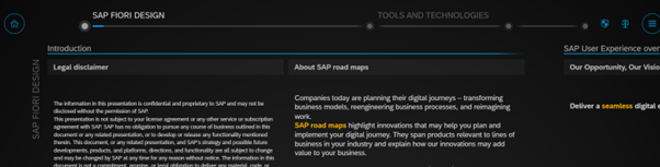 • SAP Fiori design – this gives you an overview of the current design approach of Fiori and what is new in that space