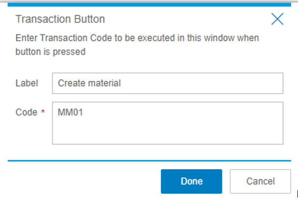 Add your label description as “Create material” and MM01 into the code and click Done.