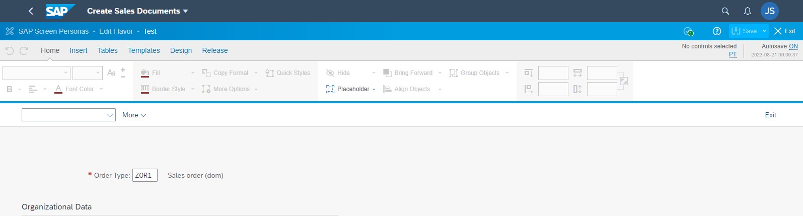Now you have created the prerequisites for SAP Screen Personas, you are ready to create your first flavour. Let’s use VA01 as a good example. I am using SAP Fiori here to process this. You can see from the screen that I have a dark blue line across the full screen with a “P” in the middle of the screen. This is the Personas prompt.