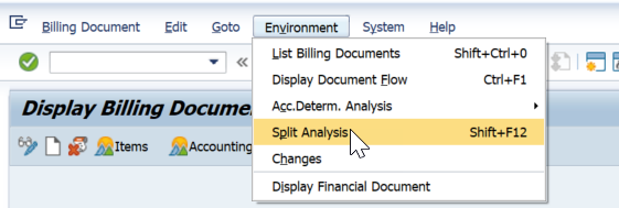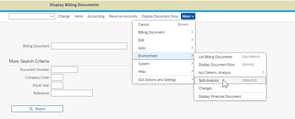In this screen, add the number of the first billing document and then, before pressing enter, from the GUI menu, select “Environment>Split Analysis” as below. From Fiori, the same menu path can be seen by first selecting “More”.