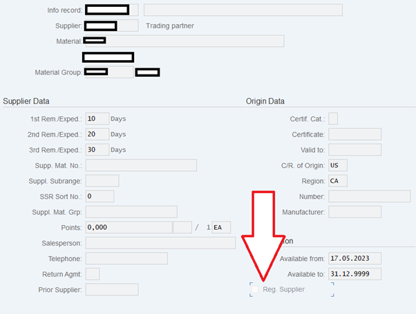 There is also a field in the Purchasing Org data of the PIR, called “Auto Sourcing” (see below). If this field is maintained, then the system automatically uses this PIR when creating purchase requisitions as part of the MRP run. In this case the “Regular Supplier” field in the General Data should not be ticked.
