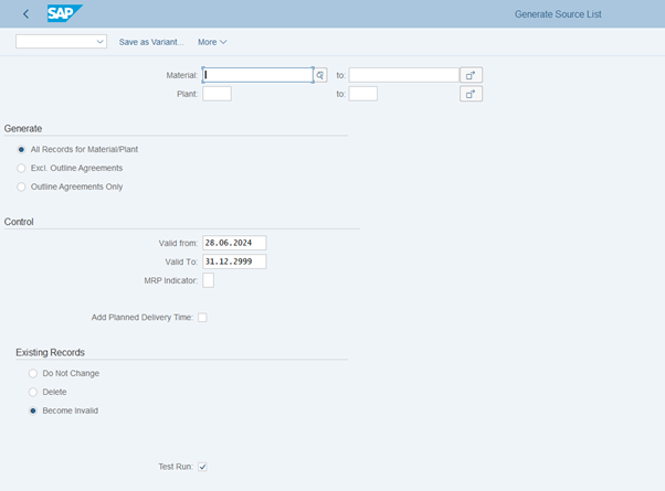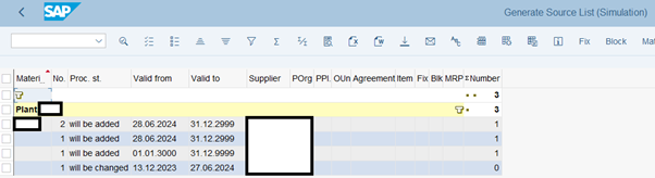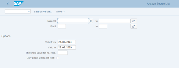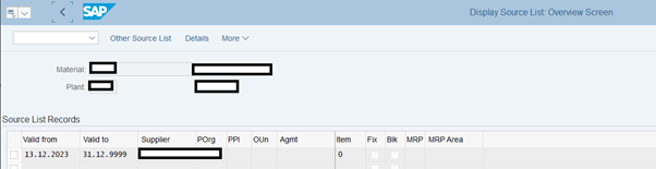 Transaction ME01 allows you to maintain (create and amend) source lists for a material and plant combination. Within this transaction, there are options for making the supplier in the source list relevant or not for MRP, fixed source (in the same way as we showed above in the PIR) and blocked. You can also specify that the supplier is the source of supply for a given validity period only.