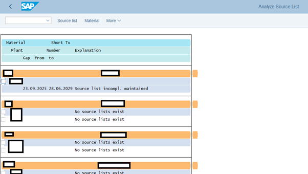Here you can analyse which materials have no source lists available. This can be done by plan or material via the selection screen below.