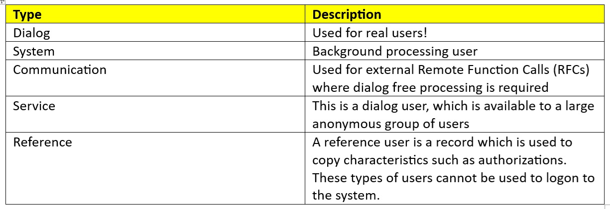 This is the user ID of whoever is logged on to the system and client in question. There are five different types of users in SAP, as below: