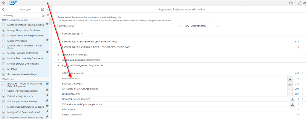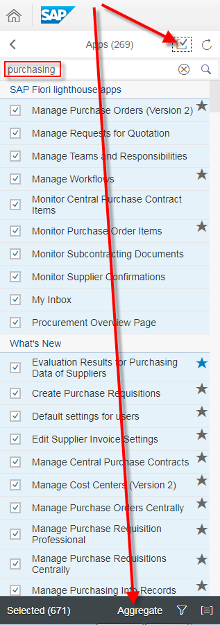 However, there is a way you can see all roles delivered for a selection of apps. For example, if you were interested in all apps related to purchasing and wanted to know which roles to activate, you can search for the word “purchasing” in the Fiori apps library to bring up anything related to purchasing (don’t worry, apps also have meta data attached to them so this search will also return apps like “Procurement overview” even though it does not contain the word “Purchasing”). From here, you can click the “Select All” button and then the “Aggregate” button as below.
