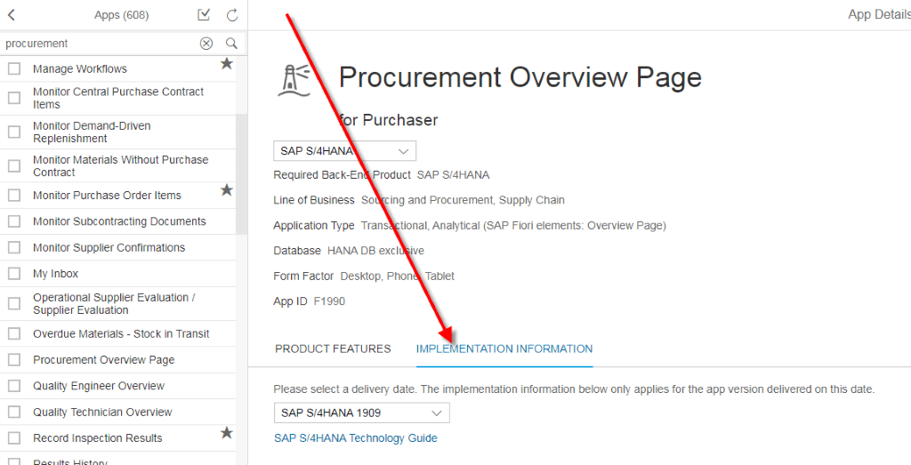 But do not despair! There is an answer to this problem. SAP have very handily provided template roles within the Fiori Apps Library. To find the roles required for specific apps, open the app in the Apps Library and click on the Implementation Information.