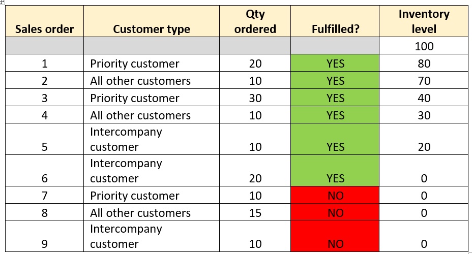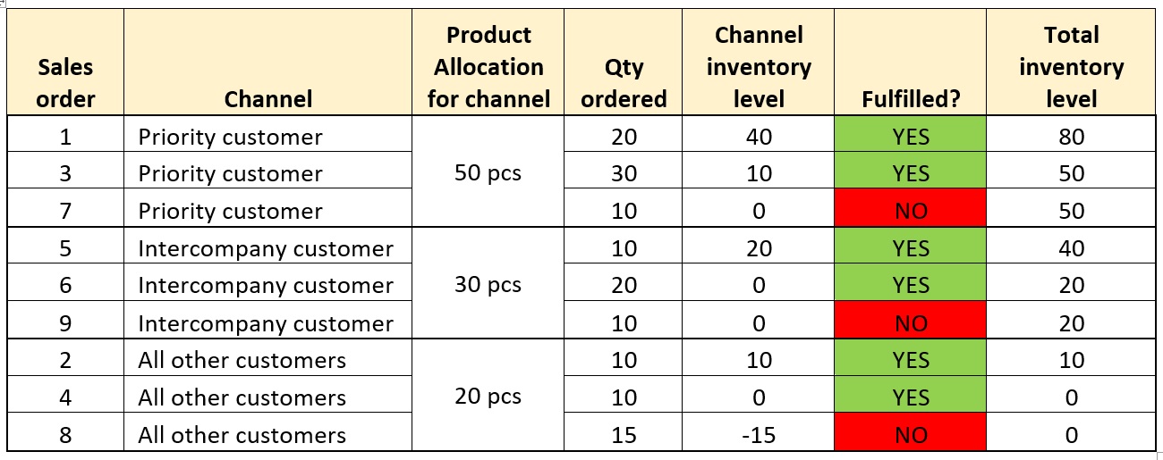 Now let’s apply some PAL logic to the same scenario. I’d like to allocate 50 pieces per month for my priority customers and 30 pieces per month for my intercompany customers and 10 pieces per month for all other customers. The outcome looks very different: