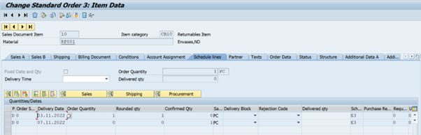 All the results of this scheduling can be seen in the Schedule Lines tab of the sales order. For example, below it can be seen that the required delivery date of 03.11.2022 cannot be met and the confirmed quantity has been added on to a second line with a confirmed delivery date of 07.11.2022.