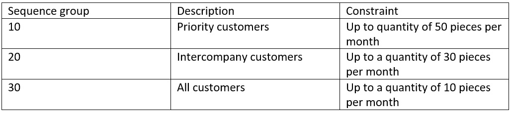 For example, let’s say we have a set of high priority customers who we must prioritise above all others. In this example, we might set aside a certain amount of stock, or a certain amount of capacity in terms of days, to that group of customers, in their own sequence group. We could then configure a second sequence group for intercompany customers and a third for all other customers.