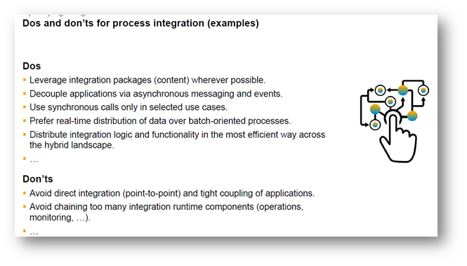The architect along with team members must brainstorm and define mandatory and optional integration style specific do’s and don’ts. They must also define a set of essential integration development standards. A sample do’s and don’ts for Process Integration style is shown in exhibit-9 below.