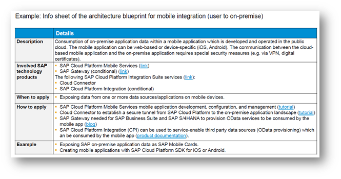 Architecture Blueprints are the “How to's’" of implementing integration scenarios. They serve as references to identify which integration technologies to choose, how to orchestrate when several integration technologies are involved and how to integrate with business applications. The relevant decision criteria, when and how to apply the blueprint, are all part of the architecture Blueprint. ISA-M templates provide sample architecture blueprints leveraging SAP Integration technologies. An example info sheet for mobile integration scenario is given in exhibit-10 below.