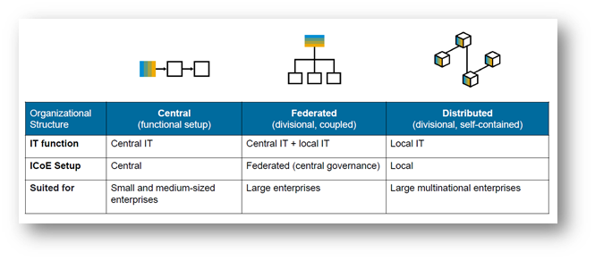 The ICoE could be established in a Centralised, Federated or Distributed manner, depending on the size and nature of the organisation. There could be other models an organisation can arrive at considering the nature of their business. Exhibit-14 below shows the models pictorially.